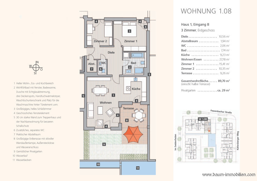 Zwischen Stadtkern und Natur entsteht hier künftig Ihr neues Zuhause. Landschaftlich reizvoll eingebettet liegt Offenburg zwischen den Höhen des Schwarzwaldes, den Rheinauen und den Elsässer Vogesen, im schönen badischen Weinbaugebiet Ortenau. Das Gebäude besticht durch klare architektonische Linienführung mit zurückhaltenden Formen und begrünten Flachdächern. Die großen Fensterflächen, die viel Licht in die zwei Zimmerwohnung bringen und eine behagliche Atmosphäre schaffen, sprechen für sich. Der Wassergarten wird ein wertvoller Bestandteil Ihrer Wohnqualität und bildet mit dem Treffpunkt mit Bäumen und Sitzgelegenheiten das Herzstück der Wohnanlage. Das Haus verfügt über einen rollstuhlgerechten Aufzug. Die teilweise überdachte Terrasse ist nach Westen ausgerichtet, der kleine Privatgarten lädt zum Verweilen ein. Die Wohnung wird mit besten Materialen wie Parkett (Eiche Schiffsboden), Fliesenboden (30 x 60), in jedem Zimmer Telefon- und Fernsehanschluss, Duschen mit Echtglasabtrennung, Bäder mit Deckeneinbauleuchten und Waschtischunterschrank und vielem mehr ausgestattet. Zur Wohnung gehört eine moderne Einbauküche, die im Kaufpreis enthalten ist. Der Tiefgaragenplatz kostet zusätzlich 20.000,-- €. Das Gebäude wird als Energieeffizienzhaus 40 mit einer Holzpelletsheizung ausgeführt, so dass zinsgünstige Darlehen und Tilgungszuschüsse bei der KfW-Bank in Anspruch genommen werden können. Die weißen Kunststofffenster werden als 3-fach-Wärmeschutzverglasung ausgeführt. Eine ideale Stadtwohnung für Jung oder Alt. Vereinbaren Sie einen Besichtigungstermin und lassen sich von der Lage und Ausstattung überzeugen.Grundrisse